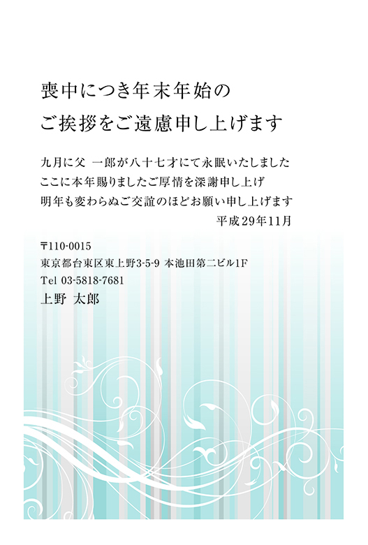 美しい紫、水色、青のグラデーションで一味違った喪中はがきを印象付けます。